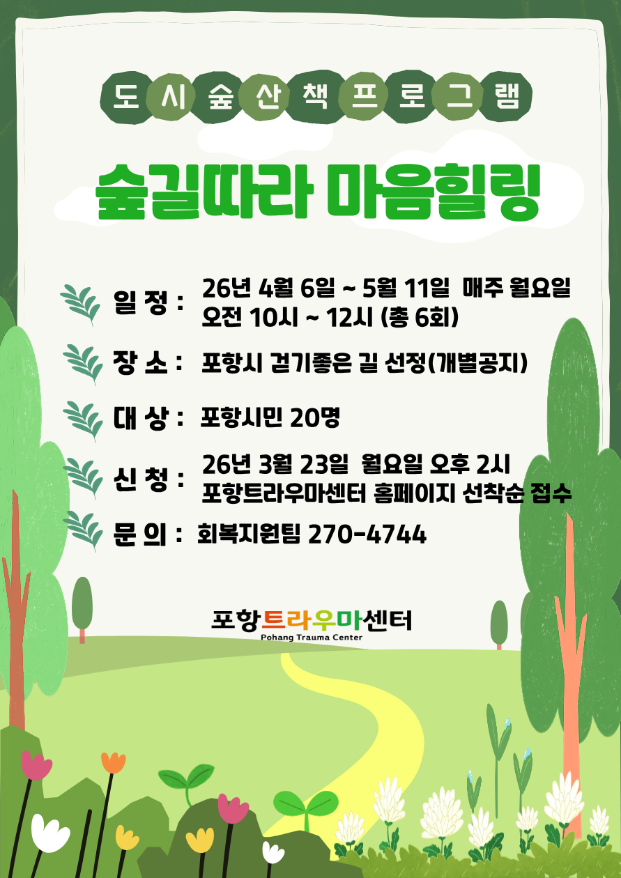 26년 함께 걷는 도시 숲 산책「숲길따라 마음힐링」참여자 모집에 많은 관심과 참여 부탁드립니다.